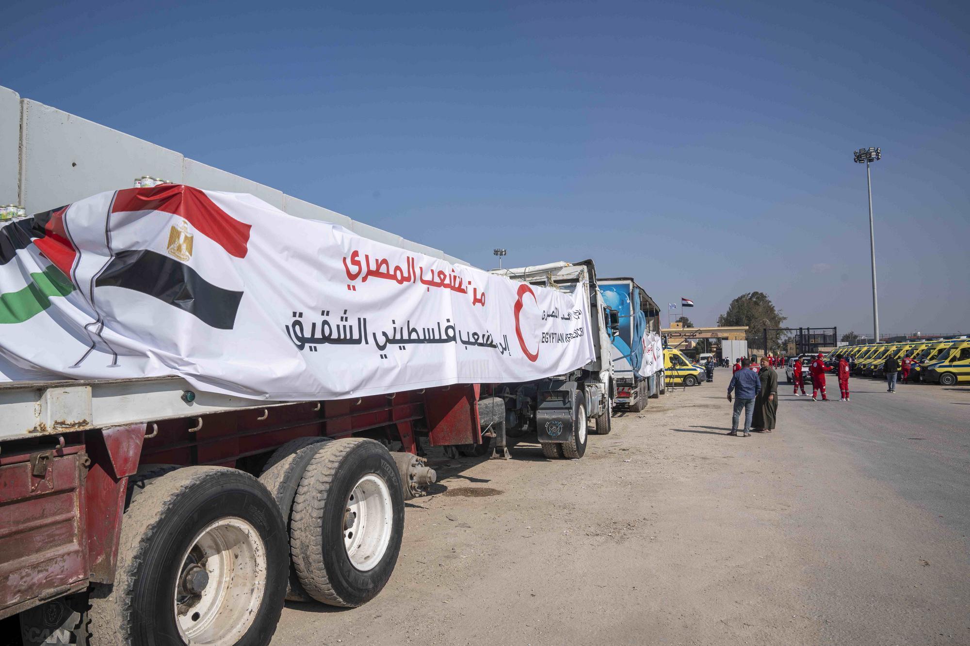 1月18日,运送援助物资的车辆和救护车在拉法口岸埃及一侧等待。新华社发策应哈马斯的也门胡塞武装18日继续袭击以色列境内目标。据以色列军方通报,胡塞武装18日向以色列发射了至少两枚导弹,耶路撒冷、特拉维夫及以色列南部度假胜地埃拉特响起警报。胡塞武装称袭击了位于特拉维夫的以色列国防部。